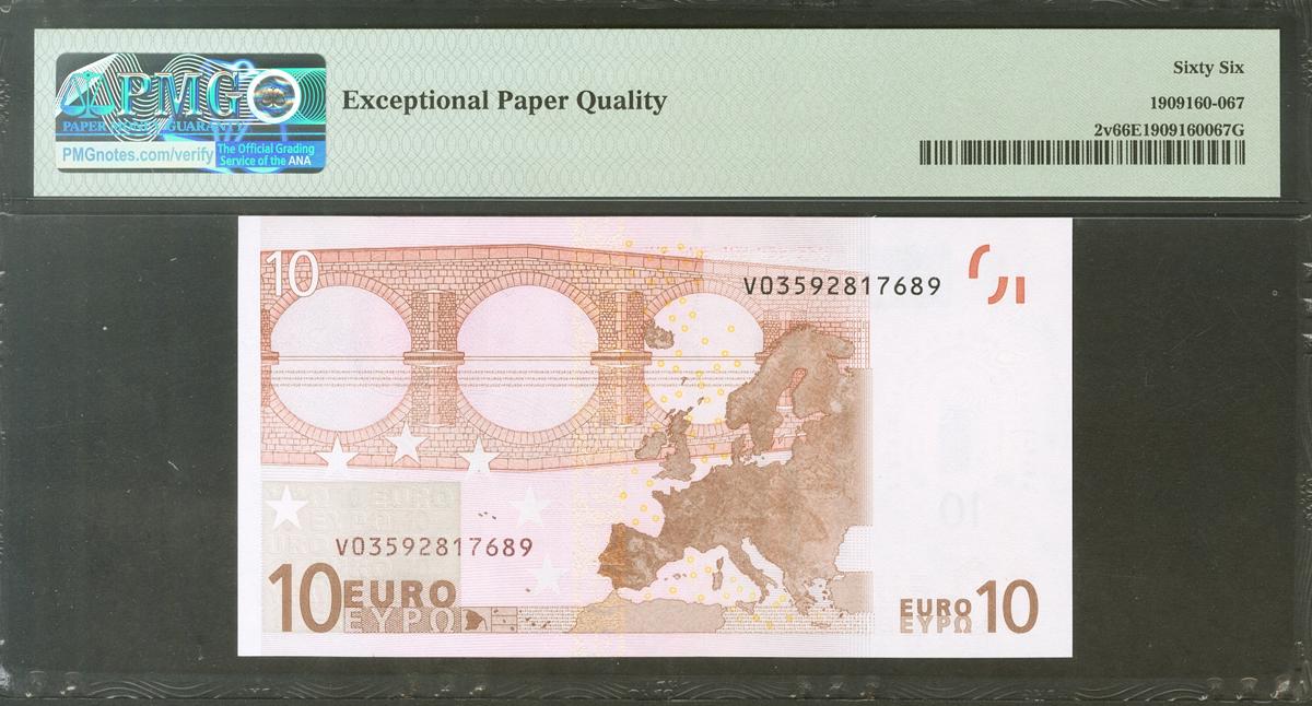 10 Euros. 1 de Enero de 2002. Firma Duisenberg. Serie V (España). (Edifil 2021: 487, Pick: 2v). SC. Encapsulado PMG66EPQ.
