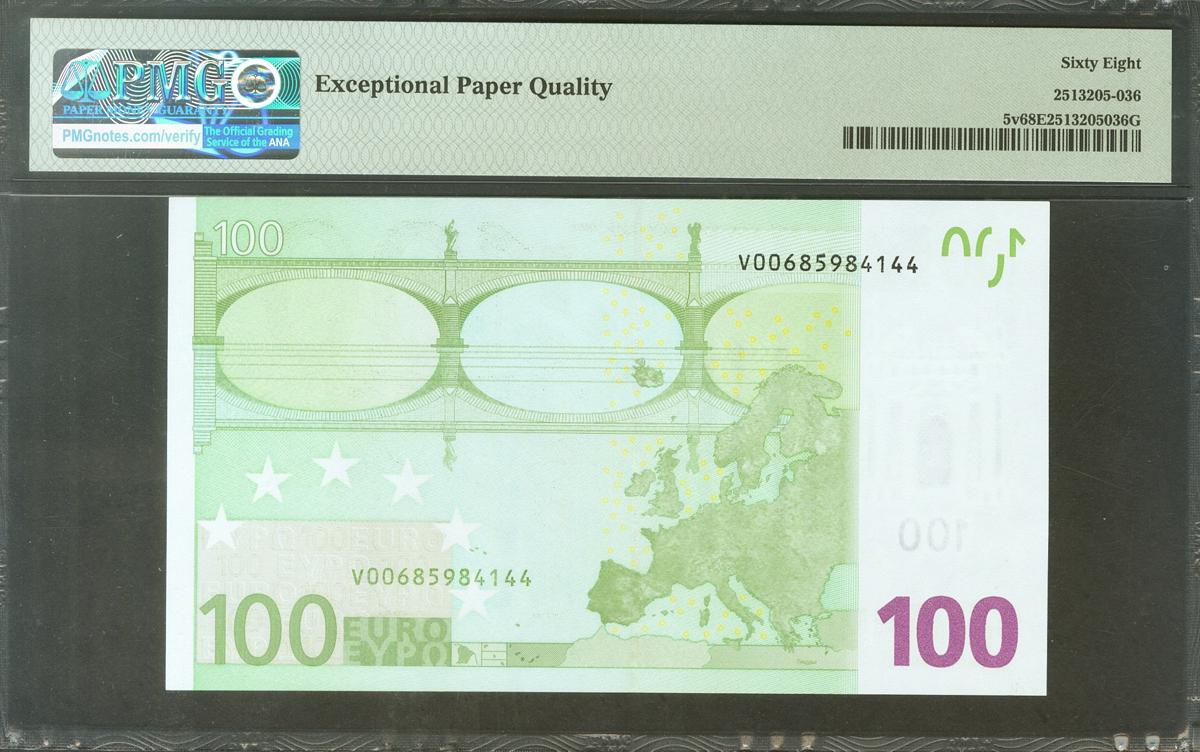 100 Euros. 1 de Enero de 2002. Firma Duisenberg. Serie V (España). (Edifil 2021: 490, Pick: 5v). SC. Encapsulado PMG68EPQ.