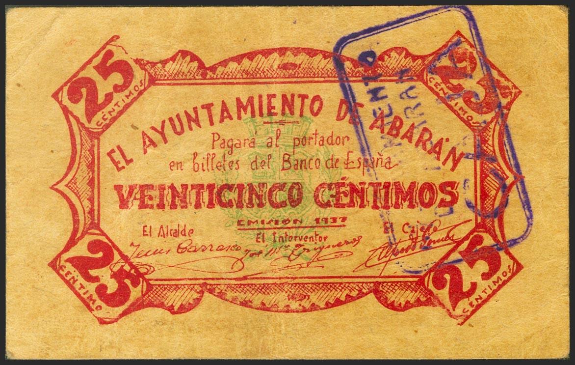 ABARAN (MURCIA). 25 Céntimos. 1937. Numeración muy baja. (González: 16). Inusual. MBC.