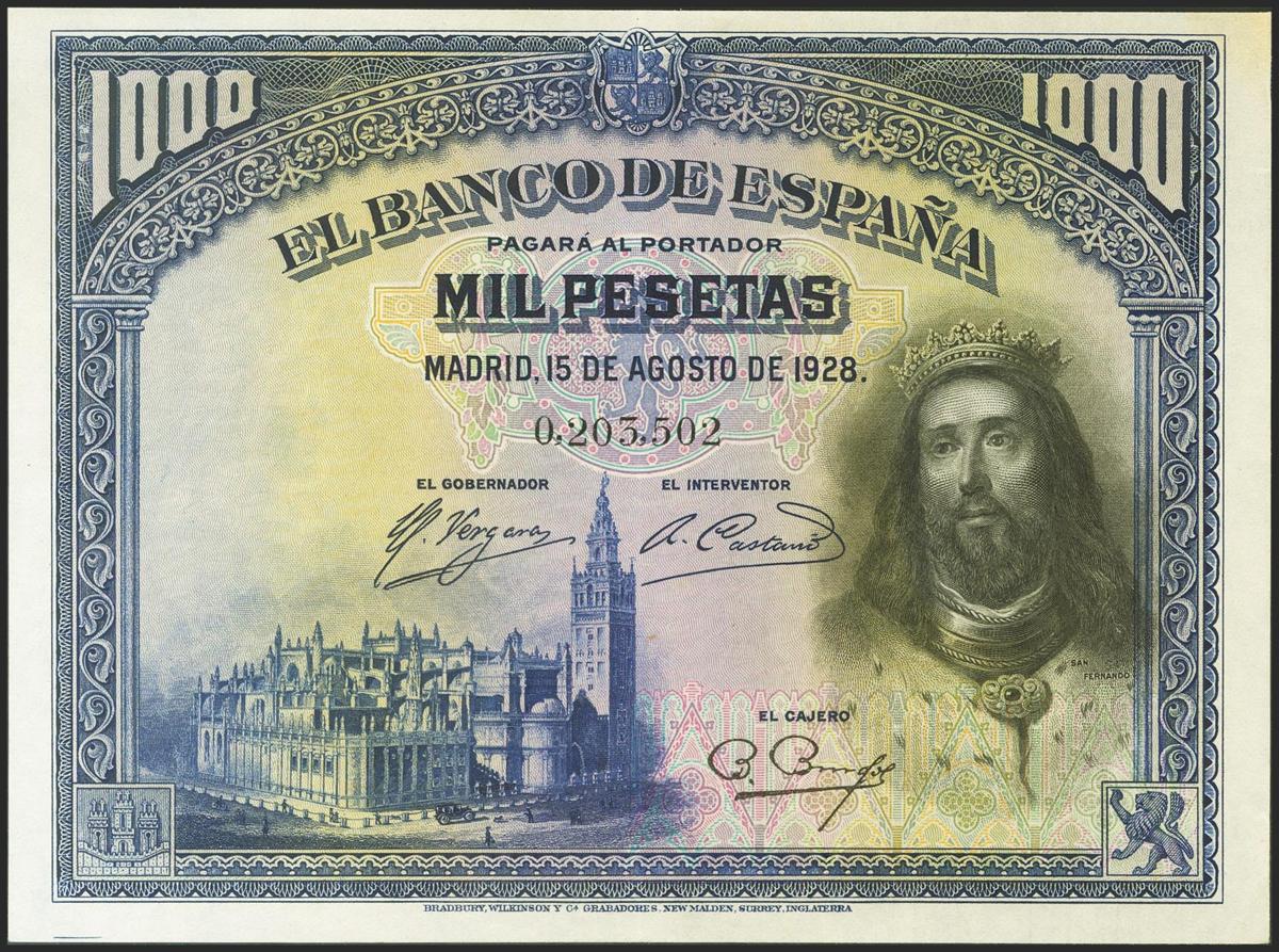 1000 Pesetas. 15 de Agosto de 1928. Sin serie y numeración baja. (Edifil 2021: 357). Conserva parte del apresto original. EBC+.