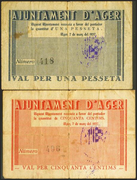 AGER (LERIDA). 50 Céntimos y 1 Peseta. 7 de Marzo de 1937. (González: 6010/11). Rara serie completa. MBC-.