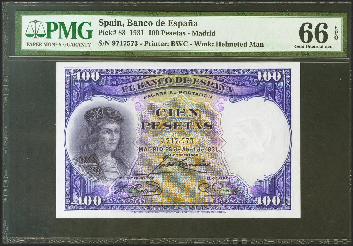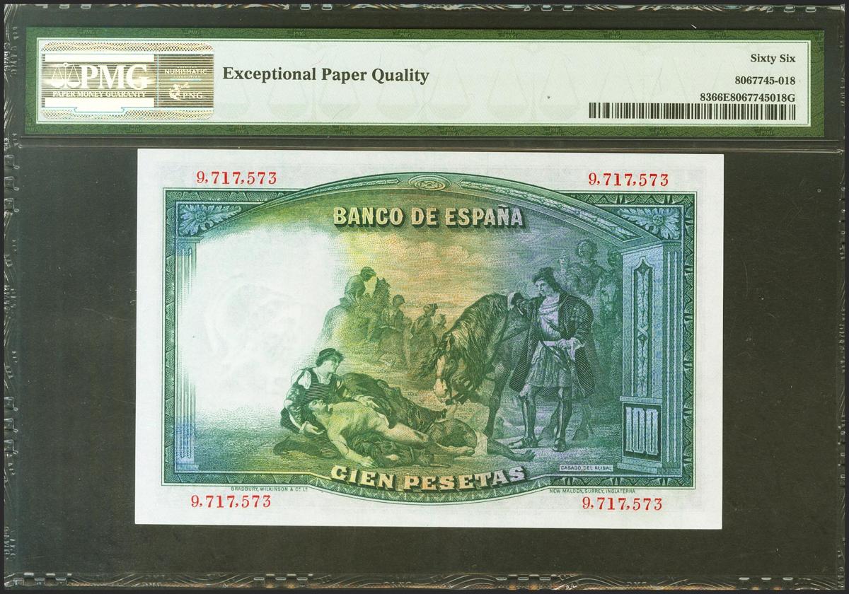 100 Pesetas. 25 de Abril de 1931. Sin serie. (Edifil 2021: 360, Pick: 83). Inusual en esta excepcional calidad, apresto original. SC. Encapsulado PMG66EPQ.