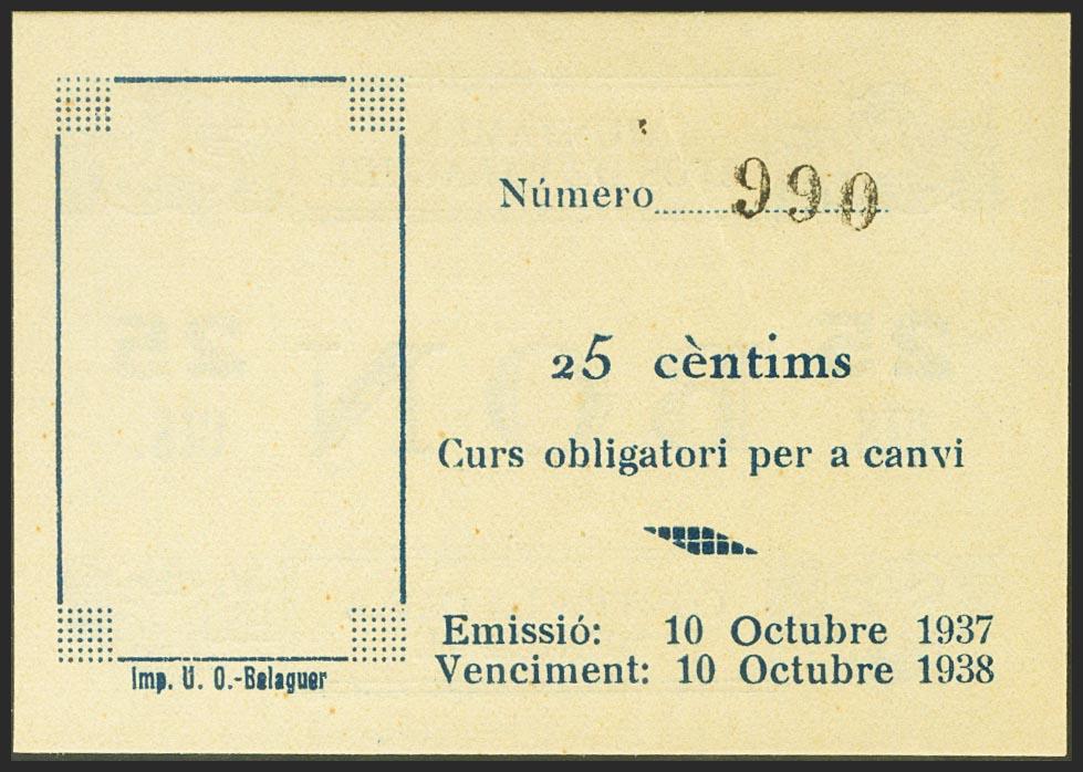OS DE BALAGUER (LERIDA). 25 Céntimos. 10 de Octubre de 1937. (González: 9052). Raro. EBC+.