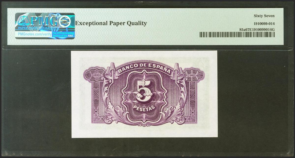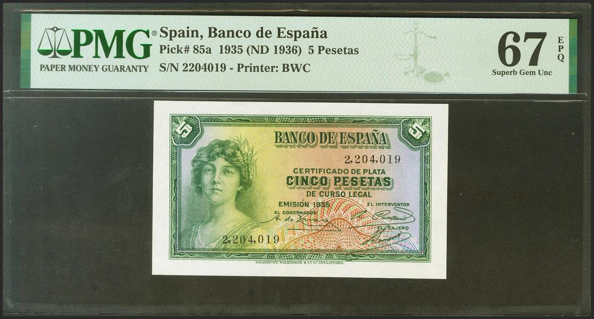 5 Pesetas. 1935. Certificado de Plata. Sin serie. (Edifil 2021: 363, Pick: 85a). Raro en esta excepcional calidad, apresto original. SC. Encapsulado PMG67EPQ.