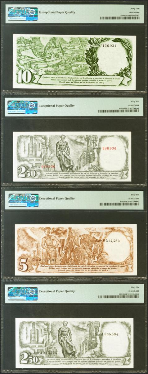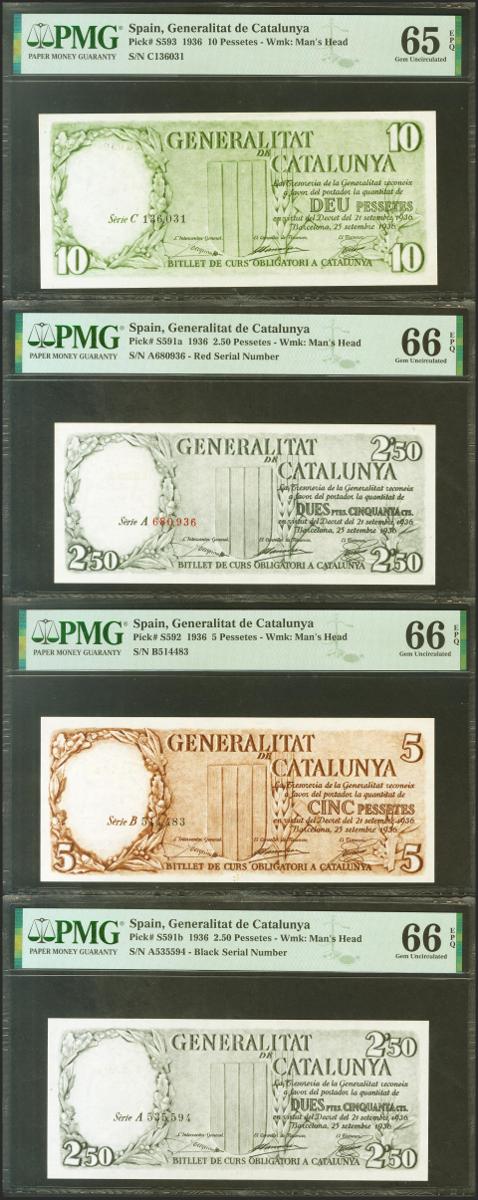 Espectacular conjunto de la serie completa de 4 billetes emitidos el 25 de Septiembre de 1936 por la Generalitat de Catalunya, compuesto por el 2´50 Pesetas (numeración negra y roja), 5 Pesetas y 10 Pesetas. (Edifil 2021: 372, 372a, 373, 374), Pick: S591a, S591b, S592, S593). Extraordinariamente raro conjunto en esta excepcional calidad y conservando su apresto original, desde que existen registros de subastas en internet no se ha subastado un juego completo sin circular (excepto una pareja correlativa de donde procede esta serie), menos aun, obviamente, en esta calidad. Encapsulados PMG66EPQ, excepto el 10 Pesetas que es 65EPQ.
