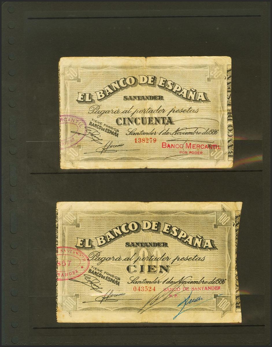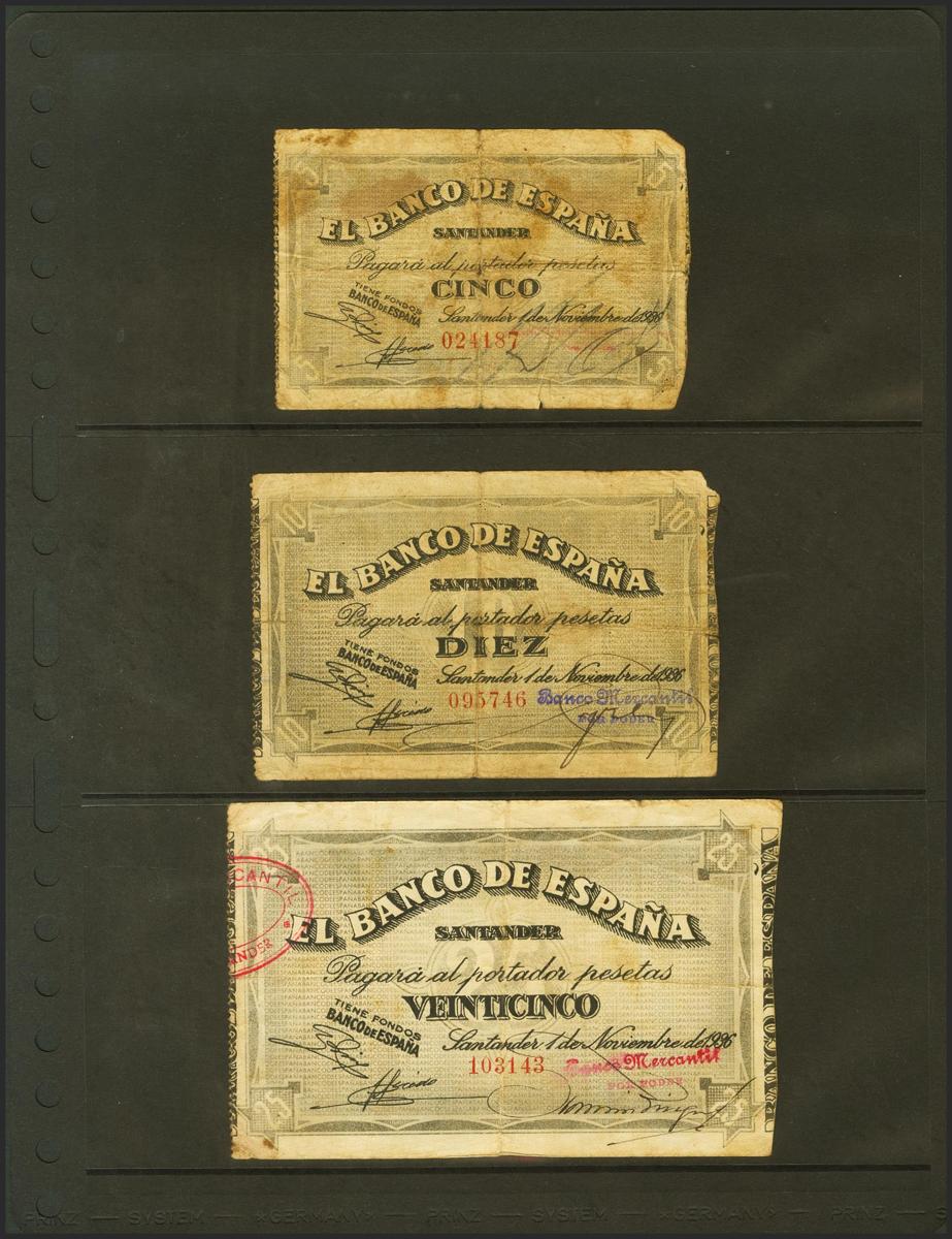 Serie de 5 billetes del Banco de España de la sucursal de Santander correspondientes a los valores de 5 Pesetas (antefirma ilegible), 10 Pesetas (antefirma Mercantil), 25 Pesetas (antefirma del Banco Mercantil), 50 Pesetas (antefirma del Banco Mercantil) y 100 Pesetas (antefirma Banco de Santander), emitidos el 1 de Noviembre de 1936. (Edifil 2021: 375, 376f, 377f, 378f, 379g). Inusual conjunto. BC/BC+.