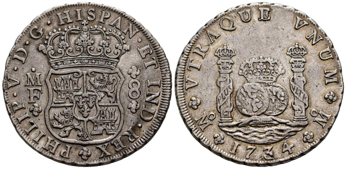 FELIPE V (1700-1746). 8 Reales. (Ar. 26,75g/40mm). 1734/3. México MF. (Cal-2019-1441). EBC-/MBC+. Bonito ejemplar, escaso así.