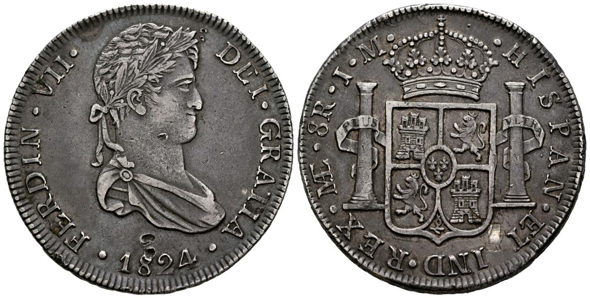 FERNANDO VII (18080-1833). 8 Reales. (Ar. 27,01g/41mm). 1824. Lima JM. (Cal-2019-1256). Único año de este busto. MBC+. Golpes de punzón en anverso y hoja en reverso. Bonita pátina negra. Raro y muy interesante ejemplar.