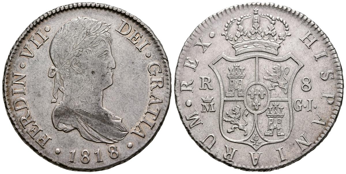 FERNANDO VII (18080-1833). 8 Reales (Ar. 26,80g/39mm). 1818/28. Madrid GJ. (Cal-2019-1274). MBC+. Muy bonito ejemplar.