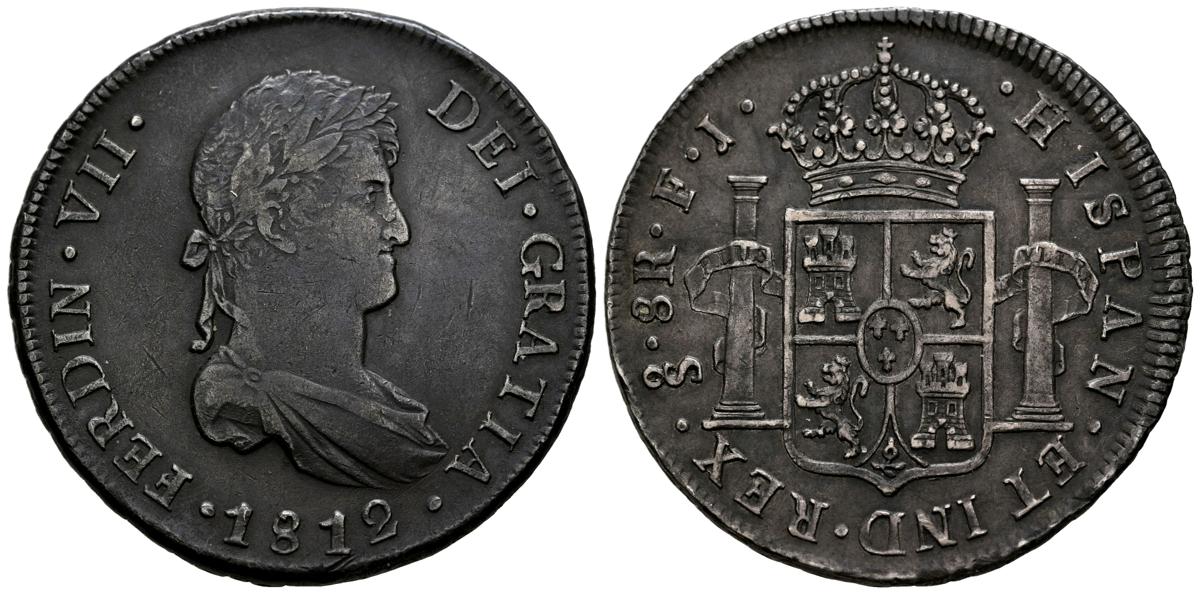 FERNANDO VII (1808-1833). 8 Reales. (Ar. 26,48g/41mm). 1812. Santiago FJ. (Cal-2019-1405). MBC/MBC+. Pátina oscura. Muy escaso y bonito ejemplar.