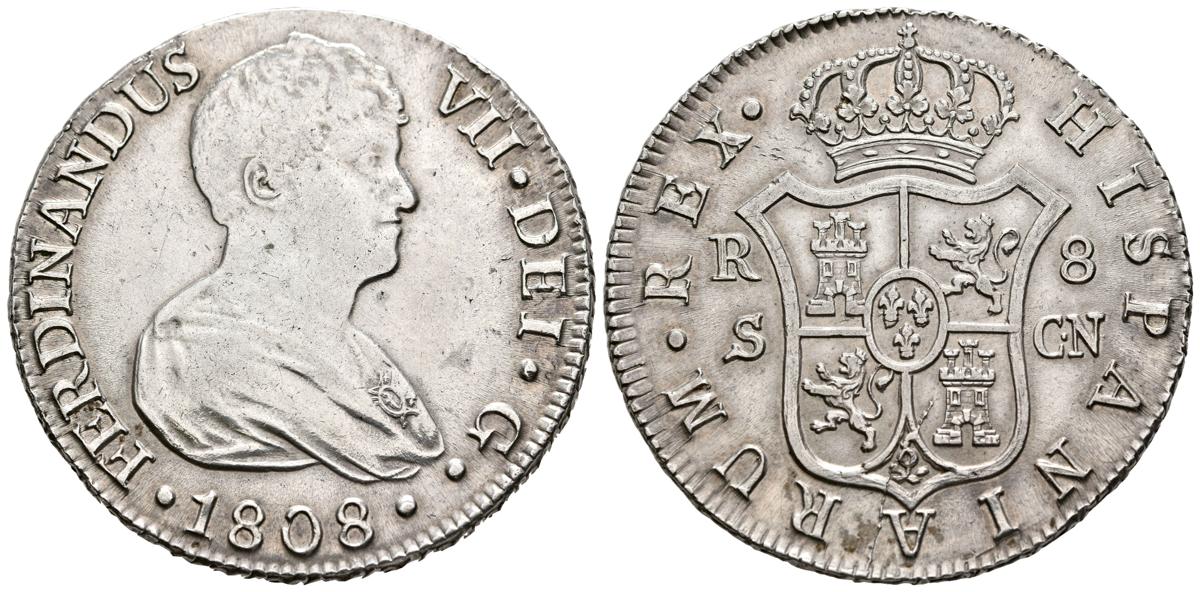FERNANDO VII (1808-1833). 8 Reales. (Ar. 26,85g/41mm). 1808. Sevilla CN. (Cal-2019-1411). Busto desnudo. EBC-/EBC. Acuñación floja en anverso típica de estas acuñaciones. Ligeramente limpiada, aun así bonito y escaso ejemplar.