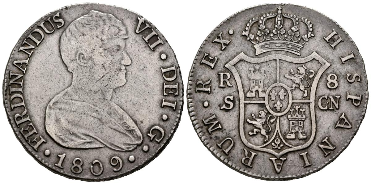 FERNANDO VII (1808-1833). 8 Reales. (Ar. 27,18g/40mm). 1809. Sevilla CN. (Cal-2019-1412). Busto desnudo. MBC+. Acuñación floja en anverso típica de estas acuñaciones.