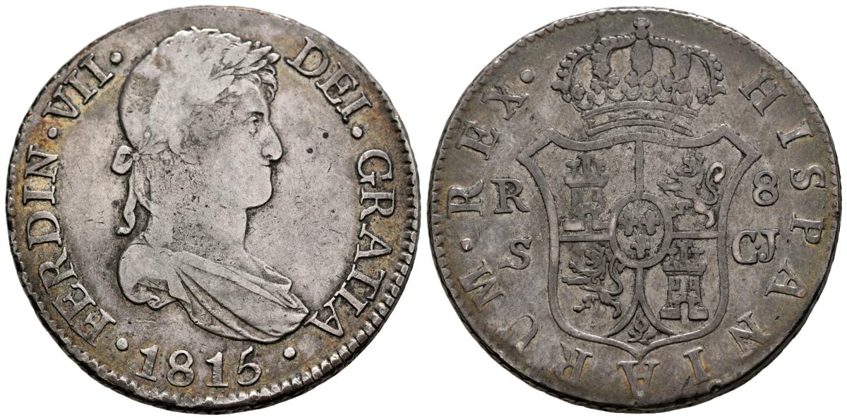 FERNANDO VII (1808-1833). 8 Reales. (Ar. 26,99g/39mm). 1815. Sevilla CJ. (Cal-2019-1416). Busto laureado. MBC-.