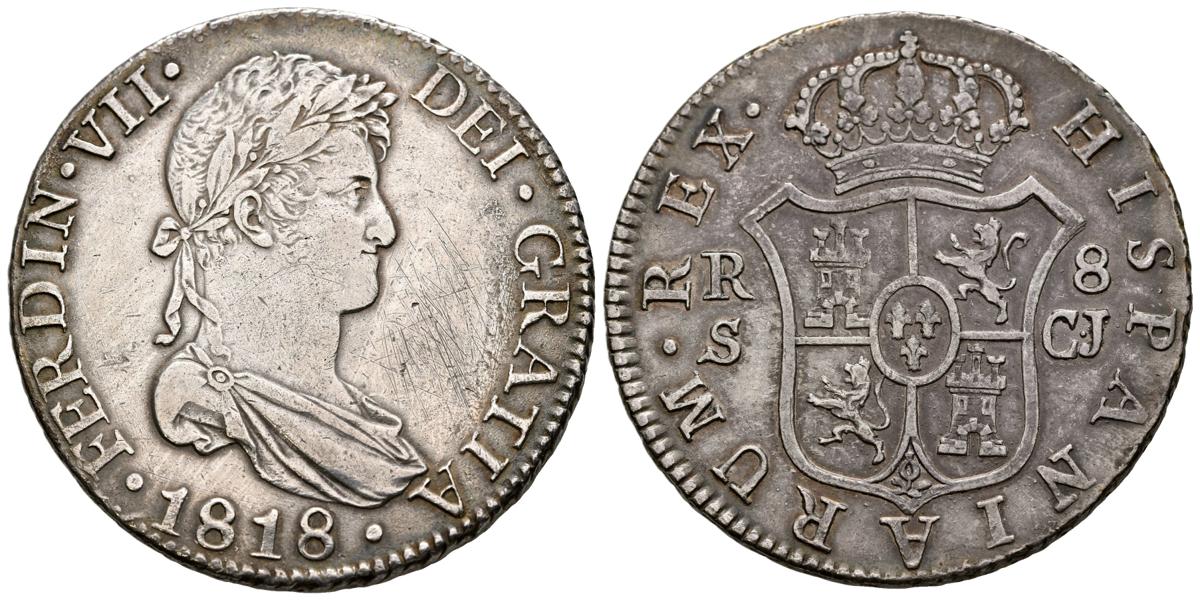 FERNANDO VII (1808-1833). 8 Reales. (Ar. 26,95g/39mm). 1818. Sevilla CJ. (Cal-2019-1419). Busto laureado. MBC+. Rayitas de limpeza.