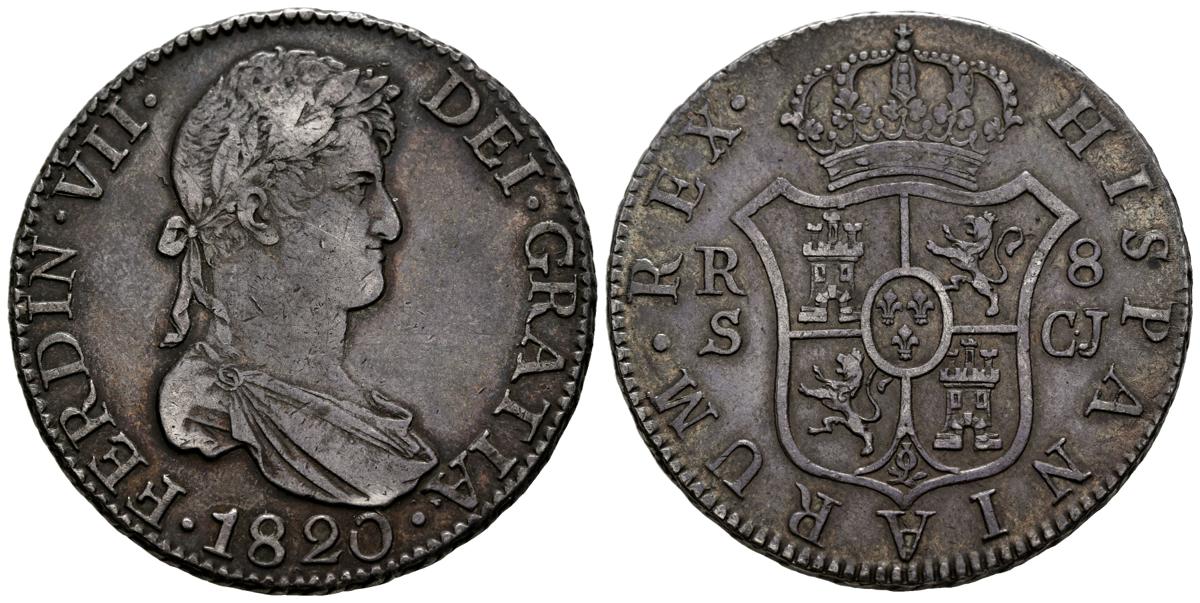FERNANDO VII (1808-1833). 8 Reales. (Ar. 26,81g/39mm). 1820. Sevilla CJ. (Cal-2019-1421). Busto laureado. MBC. Bonita pátina oscura. Escaso ejemplar.