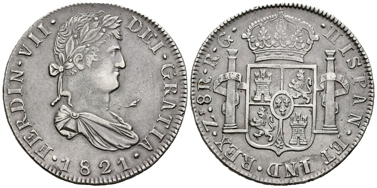 FERNANDO VII (1808-1833). 8 Reales. (Ar. 27,05g/39mm). 1821. Zacatecas RG. (Cal-2019-1465). EBC-. Exceso de metal en anverso. Buen ejemplar.