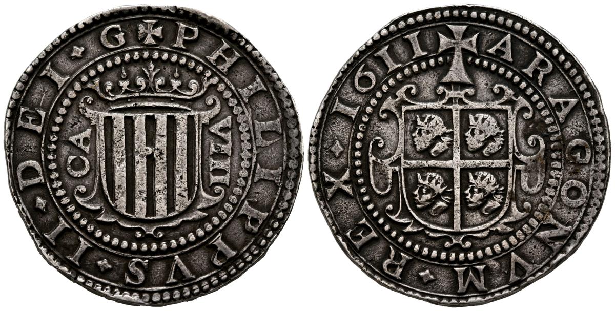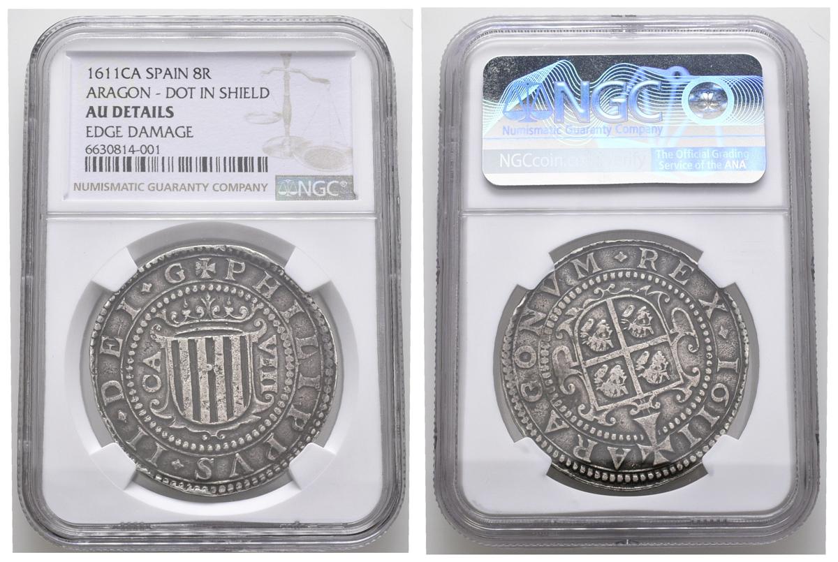 FELIPE III (1598-1621). 8 Reales. (Ar. 27,54g/39mm). 1611. Zaragoza CA. (Cal-2019-996). Punto en medio del escudo del anverso. Encapsulado por NGC AU DETAILS. Pátina oscura. Rarísimo ejemplar y más así.Ex Áureo & Calicó 331, 31/05/2018, Nº Lote 453.Felipe III (II de Aragón tal como reza en esta moneda) ordenó acuñar un número no excesivo de monedas en Aragón. Aún más reducidas fueron las piezas de módulo grande, las cuales se acuñaron prácticamente a nivel testimonial. En estos Ocho Reales de extremada rareza, destaca en el anverso el Escudo de Aragón con las cuatro barras coronadas. A la izquierda las letras CA (marca de ceca) y VIII a la derecha y leyenda alrededor. En el reverso, el escudo con cuatro cuarteles y una cabeza de moro de la batalla de Alcoraz en cada cuartel (detalle que ya fue introducido en sus monedas por Juana y Carlos) coronado por la cruz de Íñigo Arista, acompañado de leyenda. Es una moneda de clara asimilación castellana que no tuvo continuidad en este reino ya que en Cataluña, se siguió con la acuñación del croat, y en Valencia con los divuités, todos con un módulo sensiblemente inferior.