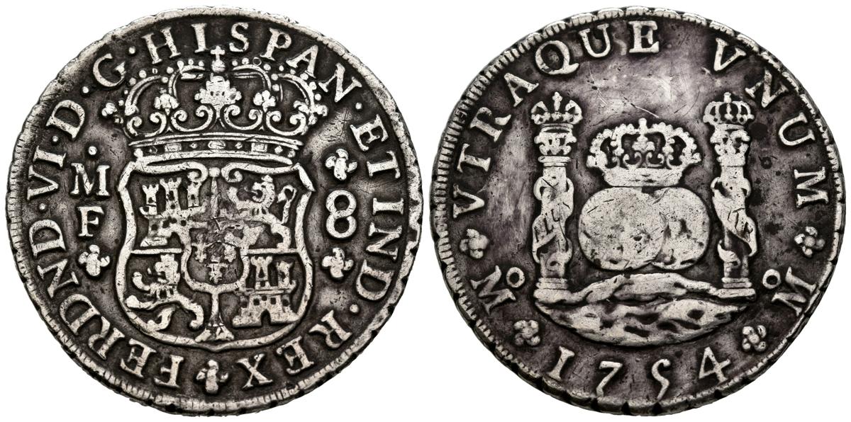 FERNANDO VI (1746-1759). 8 Reales. (Ar. 26,57g/40mm). 1754. México MF. (Cal-2019-485). Corona real e imperial. MBC-.