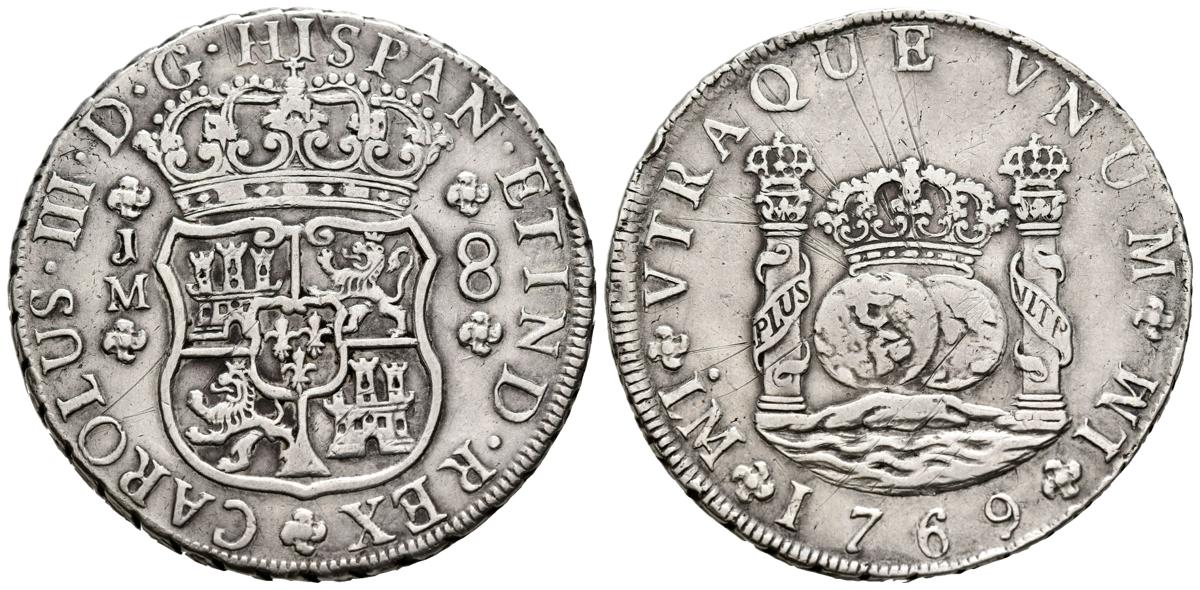 CARLOS III (1759-1788). 8 Reales. (Ar. 26,77g/39mm). 1769. Lima JM. (Cal-2019-1029). Segundo monograma sin punto. MBC+/MBC. Rayas en reverso.
