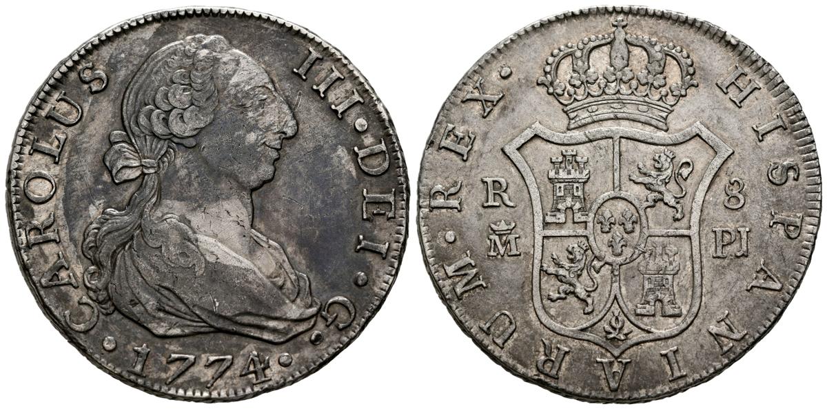 CARLOS III (1759-1788). 8 Reales. (Ar. 26,84g/39mm). 1774. Madrid JP. (Cal-2019-1064). MBC/MBC+. Raya en anverso. Preciosa pátina con restos de brillo original en reverso. Escaso ejemplar.Ex Áureo & Calicó 263, Colección Isabel de Trastámara 29/10/2014, Nº Lote 432.