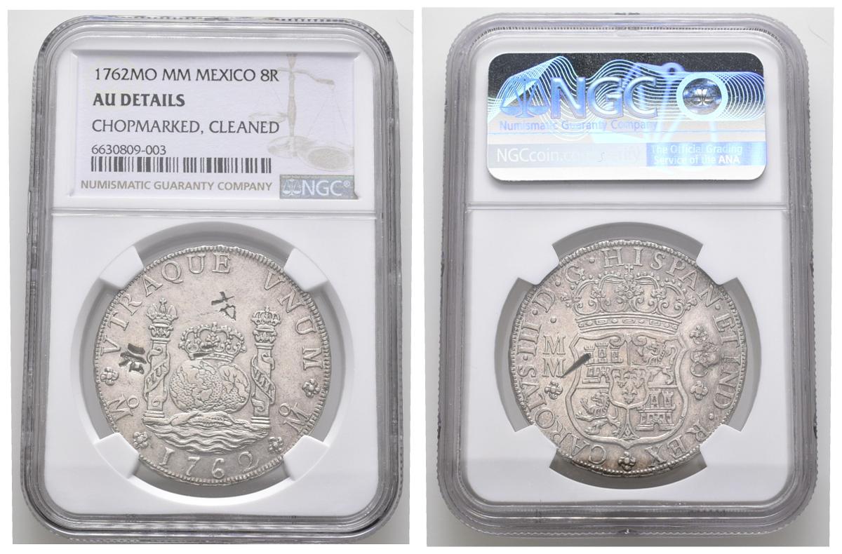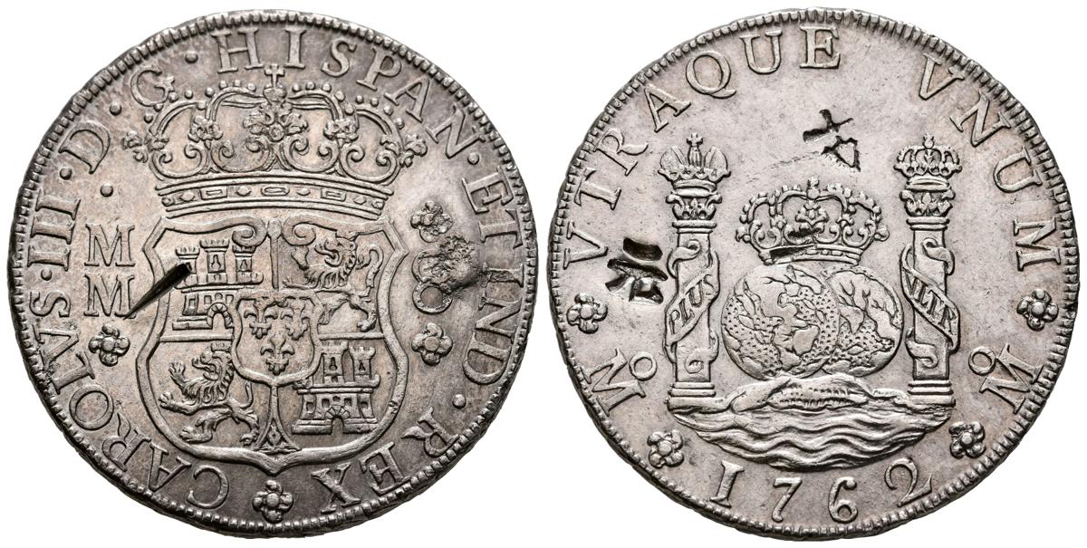CARLOS III (1759-1788). 8 Reales. (Ar. 27,34g/38mm). 1762. México MM. (Cal-2019-1080). Cruz entre H e I. Resellos orientales. Encapsulado por NGC AU DETAILS. Rayitas de limpieza. Golpe en anverso.