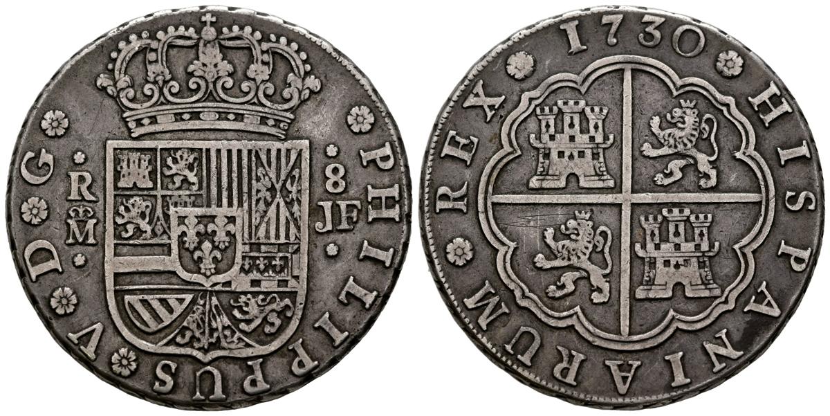 FELIPE V (1700-1746). 8 Reales. (Ar. 26,62g/39mm). 1730. Madrid JF. (Cal-2019-1351). MBC. Bonita pátina. Escaso ejemplar.