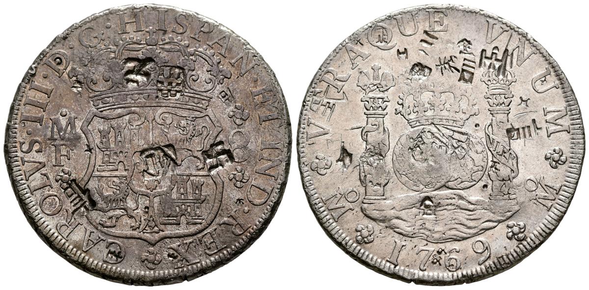 CARLOS III (1759-1788). 8 Reales. (Ar. 26,79g/39mm). 1769. México MF. (Cal-2019-1095). MBC+. Resellos orientales. Bonita pátina.