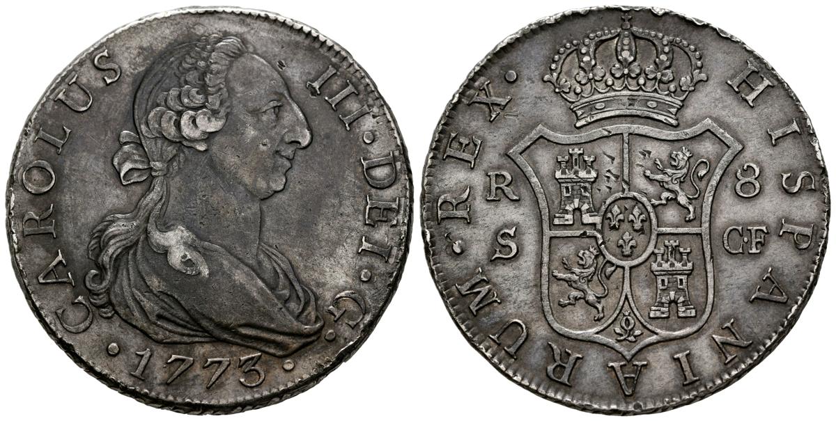CARLOS III (1759-1788). 8 Reales. (Ar. 26,70g/41mm). 1773. Sevilla CF. (Cal-2019-1230). MBC+. Marquitas. Pátina oscura. Raro ejemplar.