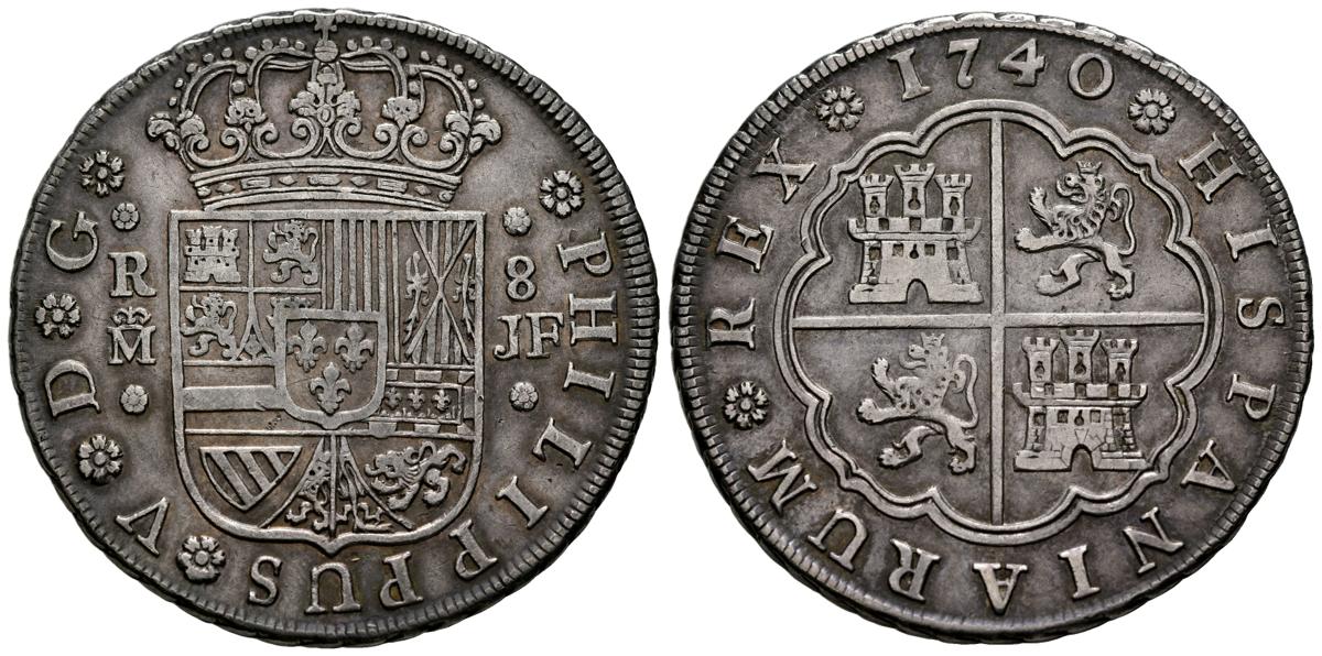 FELIPE V (1700-1746). 8 Reales. (Ar. 27,04g/39mm). 1740. Madrid JF. (Cal-2019-1358). MBC+. Extraordinaria pátina. Escaso y bonito ejemplar.