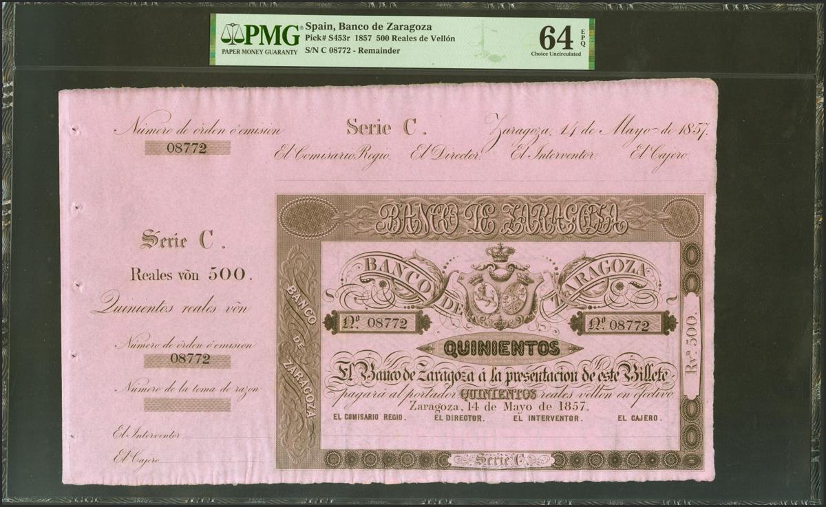 500 Reales. 14 de Mayo de 1857. Banco de Zaragoza. Serie C y con matriz. (Edifil 2021: 128B, Pick: S453r). Raro en esta calidad, apresto original. SC. Encapsulado PMG64EPQ.