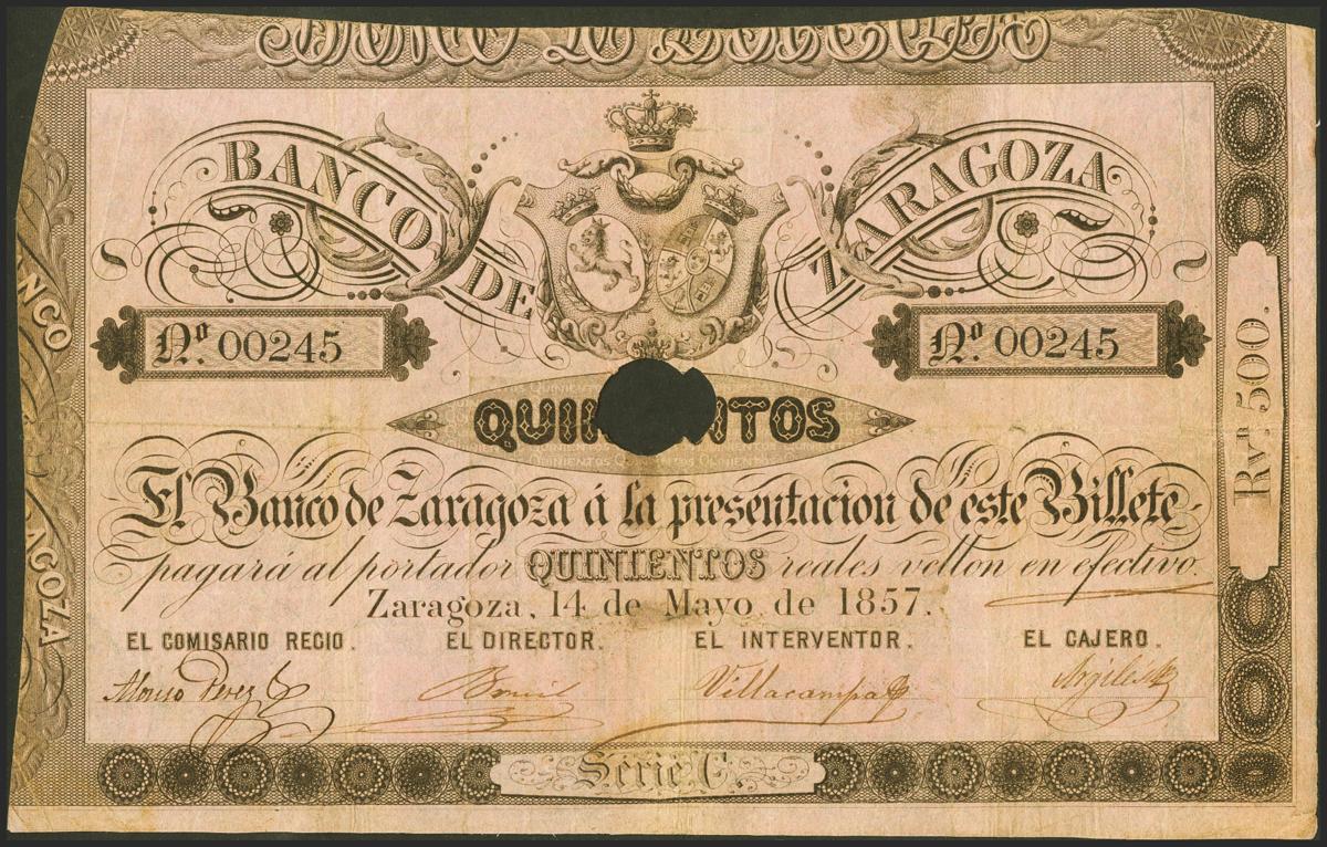 500 Reales. 14 de Mayo de 1857. Banco de Zaragoza. Serie C, con taladro y con firmas. (Edifil 2017: 128A). Inusual. MBC+.