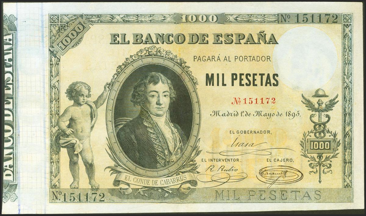 1000 Pesetas. 1 de Mayo de 1895. Sin serie. (Edifil 2021: 303). Muy raro y billete de espectacular presencia, que se ve realzada por sus enormes dimensiones, reparado profesionalmente. MBC+.