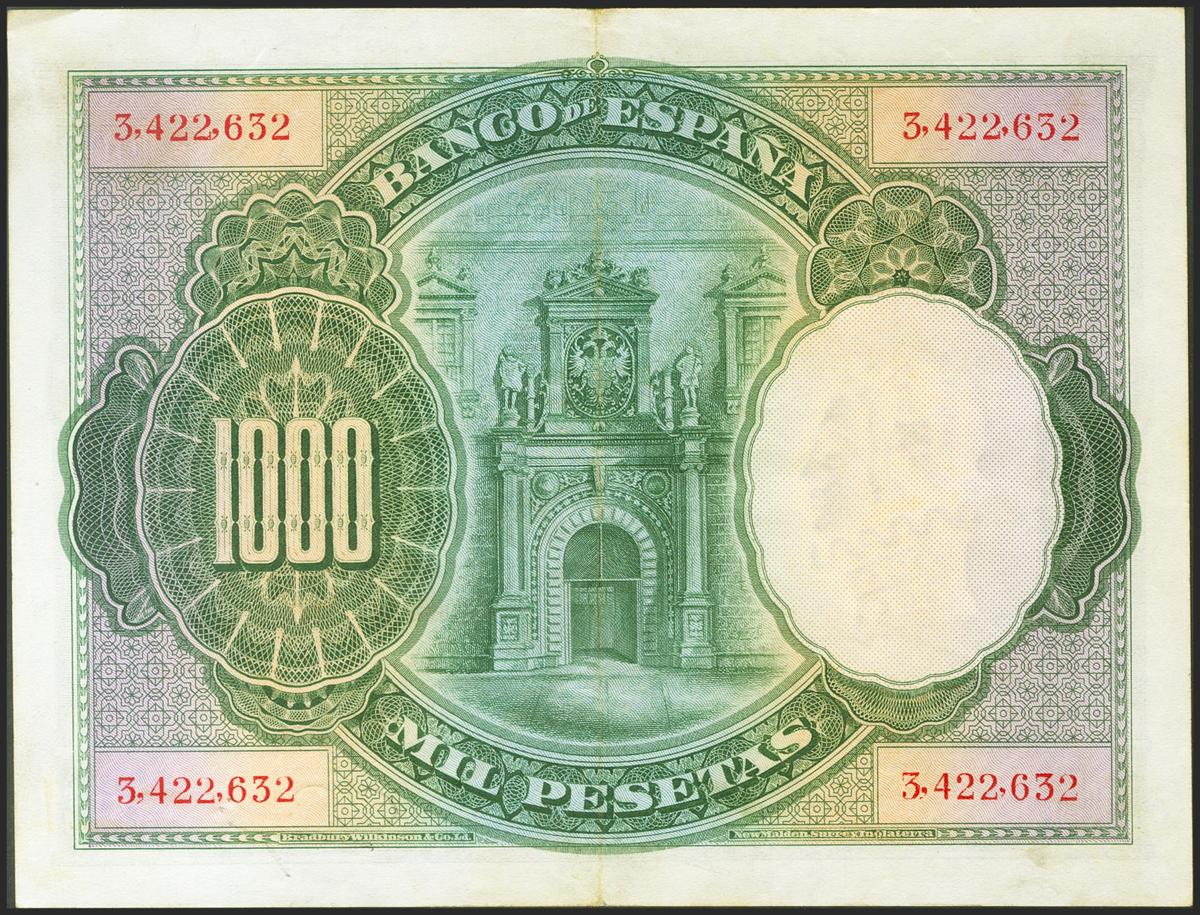 1000 Pesetas. 1 de Julio de 1925. Sin serie y numeración anterior a 3646000. (Edifil 2021: 324). Conserva algo de apresto original. EBC.