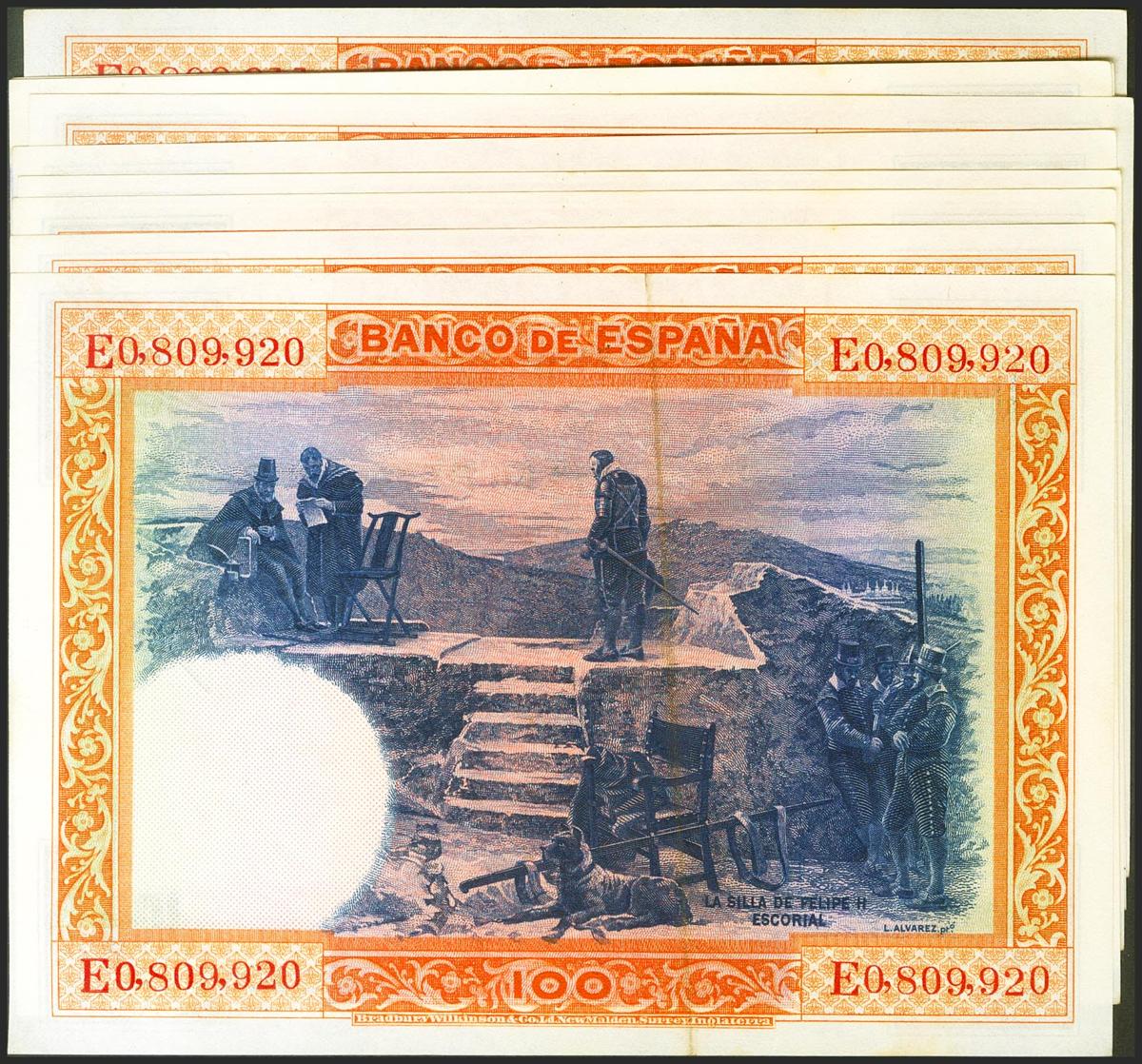 Conjunto de 10 billetes correlativos de 100 Pesetas emitidos el 1 de Julio de 1925 con la serie E (Edifil 2021: 350), conservando todo su apresto original. EBC+.