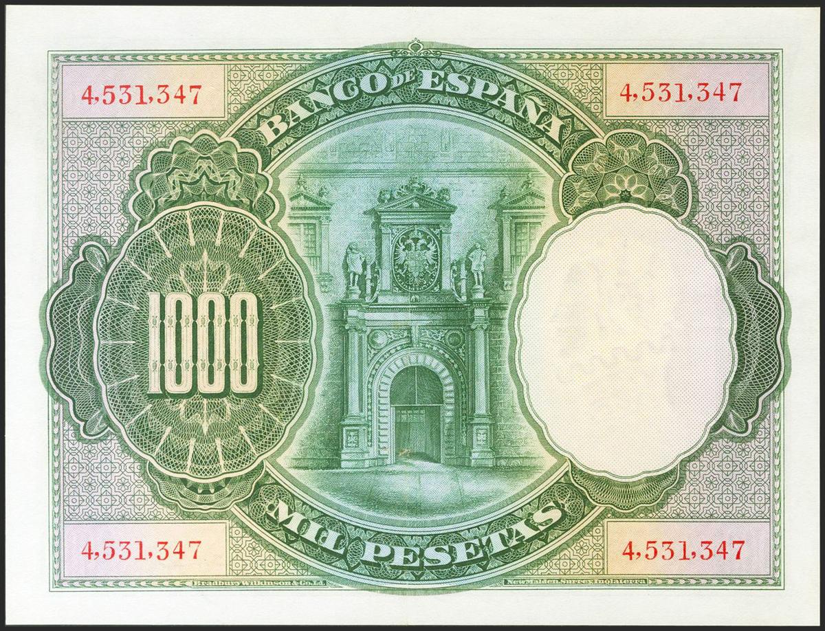 1000 Pesetas. 1 de Julio de 1925. Sin serie y numeración posterior a 3646000. (Edifil 2021: 351). Conserva parte del apresto original. EBC.
