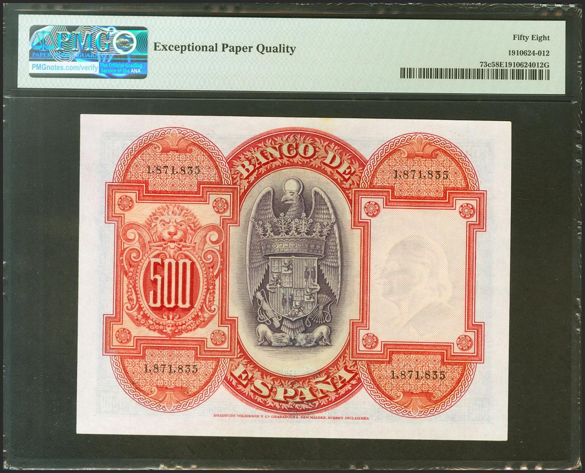 500 Pesetas. 24 de Julio de 1927. Sin serie y numeración posterior 1602000. (Edifil 2021: 352, Pick: 73c). Inusual en esta excepcional calidad, apresto original. EBC+++. Encapsulado PMG58EPQ.