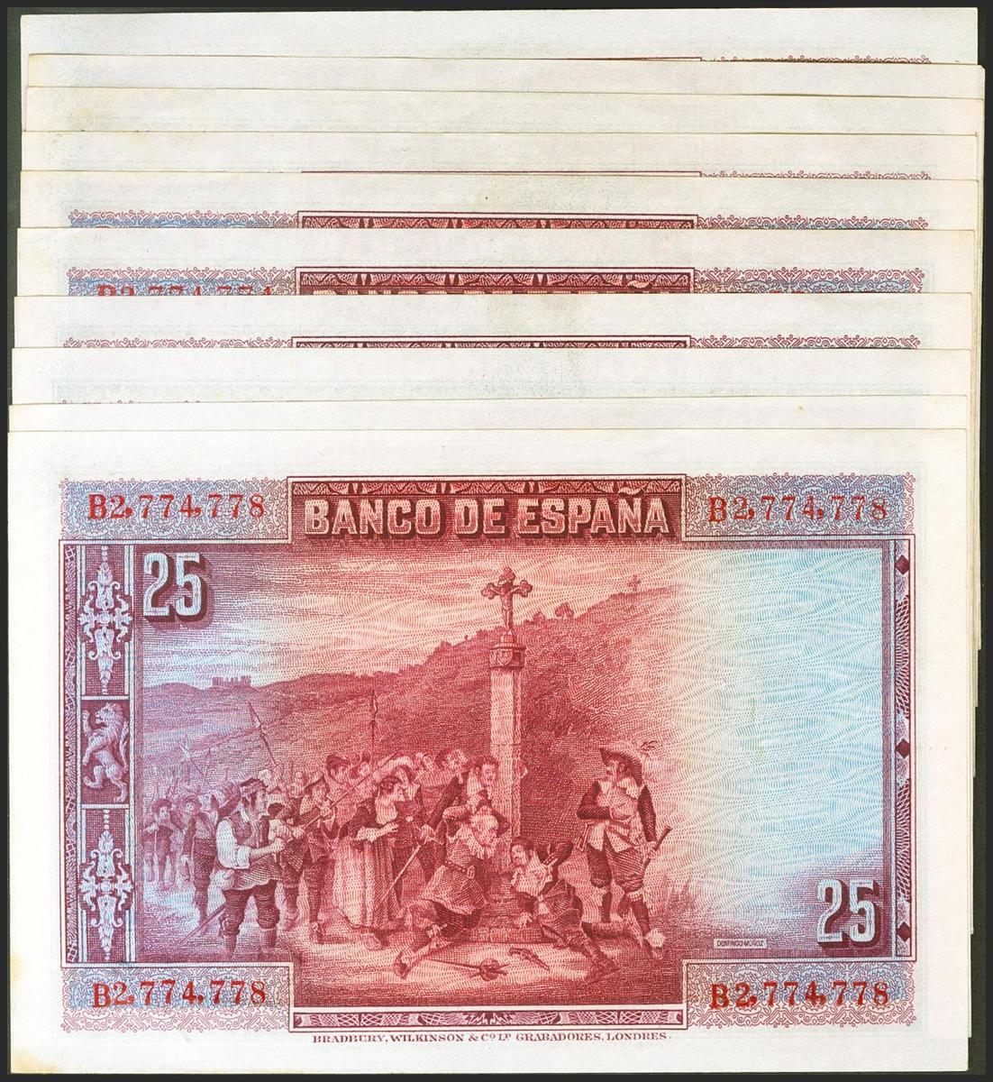 Precioso conjunto de 10 billetes correlativos de 25 Pesetas emitidos el 15 de Agosto de 1928 con la serie B (Edifil 2021: 353), conservando todo su apresto original. SC/SC-.