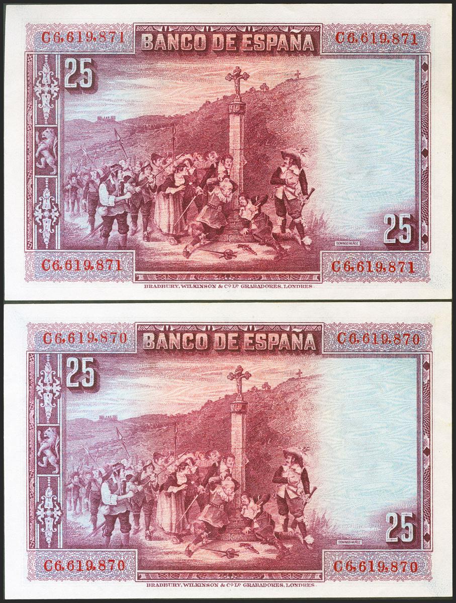 25 Pesetas. 15 de Agosto de 1928. Pareja correlativa. Serie C. (Edifil 2021: 353). Apresto original. SC-.