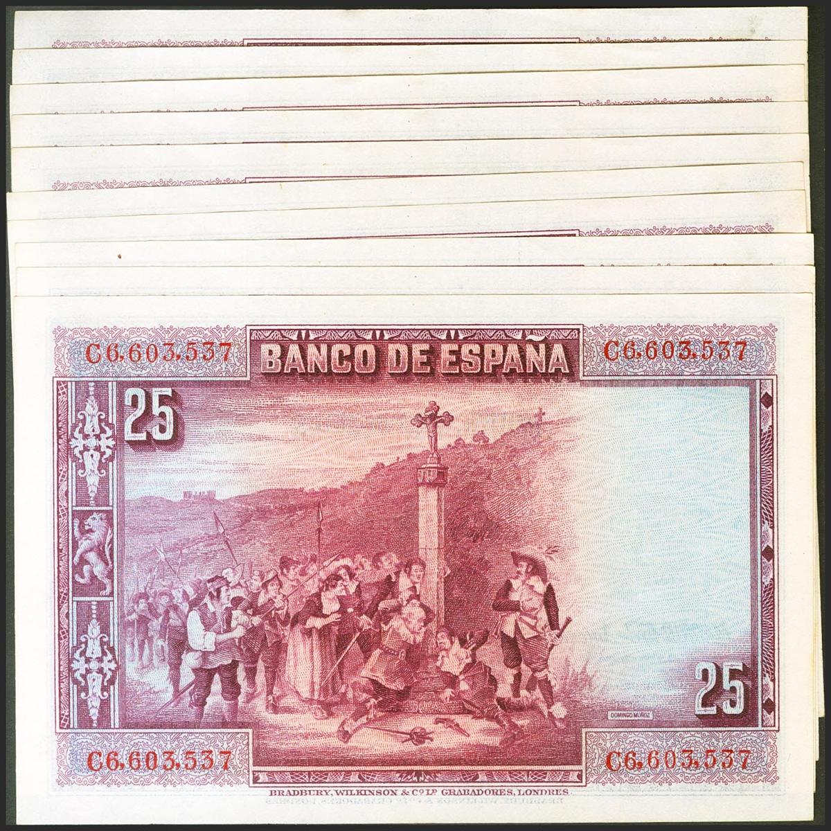 Precioso conjunto de 10 billetes correlativos de 25 Pesetas emitidos el 15 de Agosto de 1928 con la serie C (Edifil 2021: 353), conservando todo su apresto original. SC/SC-.