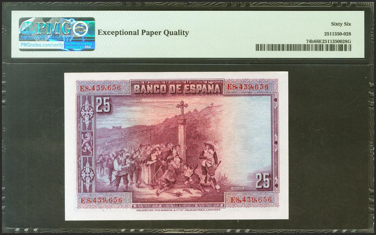25 Pesetas. 15 de Agosto de 1928. Serie E. (Edifil 2021: 353, Pick: 74b). Inusual en esta excepcional calidad, apresto original. SC. Encapsulado PMG66EPQ.