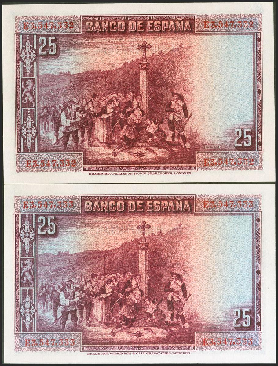 25 Pesetas. 15 de Agosto de 1928. Pareja correlativa. Serie E. (Edifil 2021: 353). Conserva todo su apresto original. SC-.