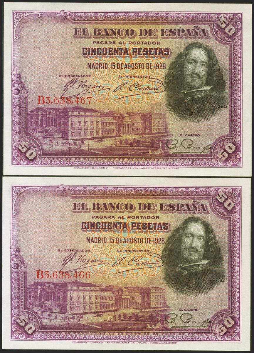 50 Pesetas. 15 de Agosto de 1928. Pareja correlativa. Inusual serie B. (Edifil 2021: 354). Apresto original. SC.