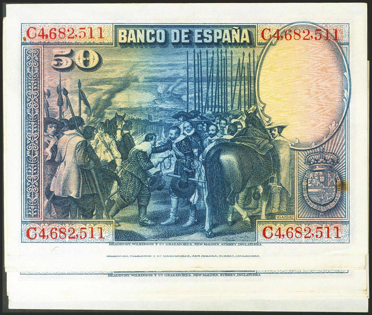 Conjunto de 10 billetes correlativos y en diferentes tramos de 50 Pesetas emitidos el 15 de Agosto de 1928 y con la serie C (Edifil 2021: 354), conservando la mayor parte del apresto original. EBC+/EBC.