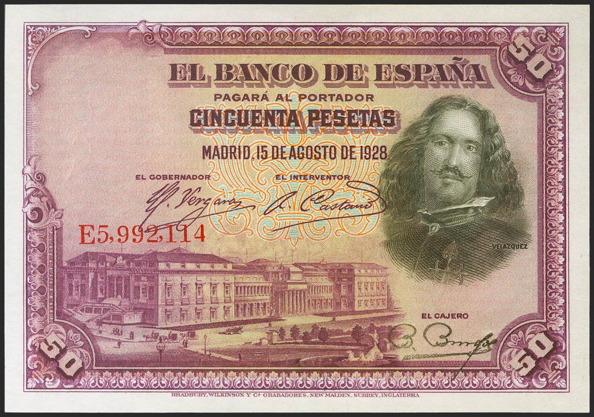 50 Pesetas. 15 de Agosto de 1928. Serie E. (Edifil 2021: 354). Apresto original. SC.