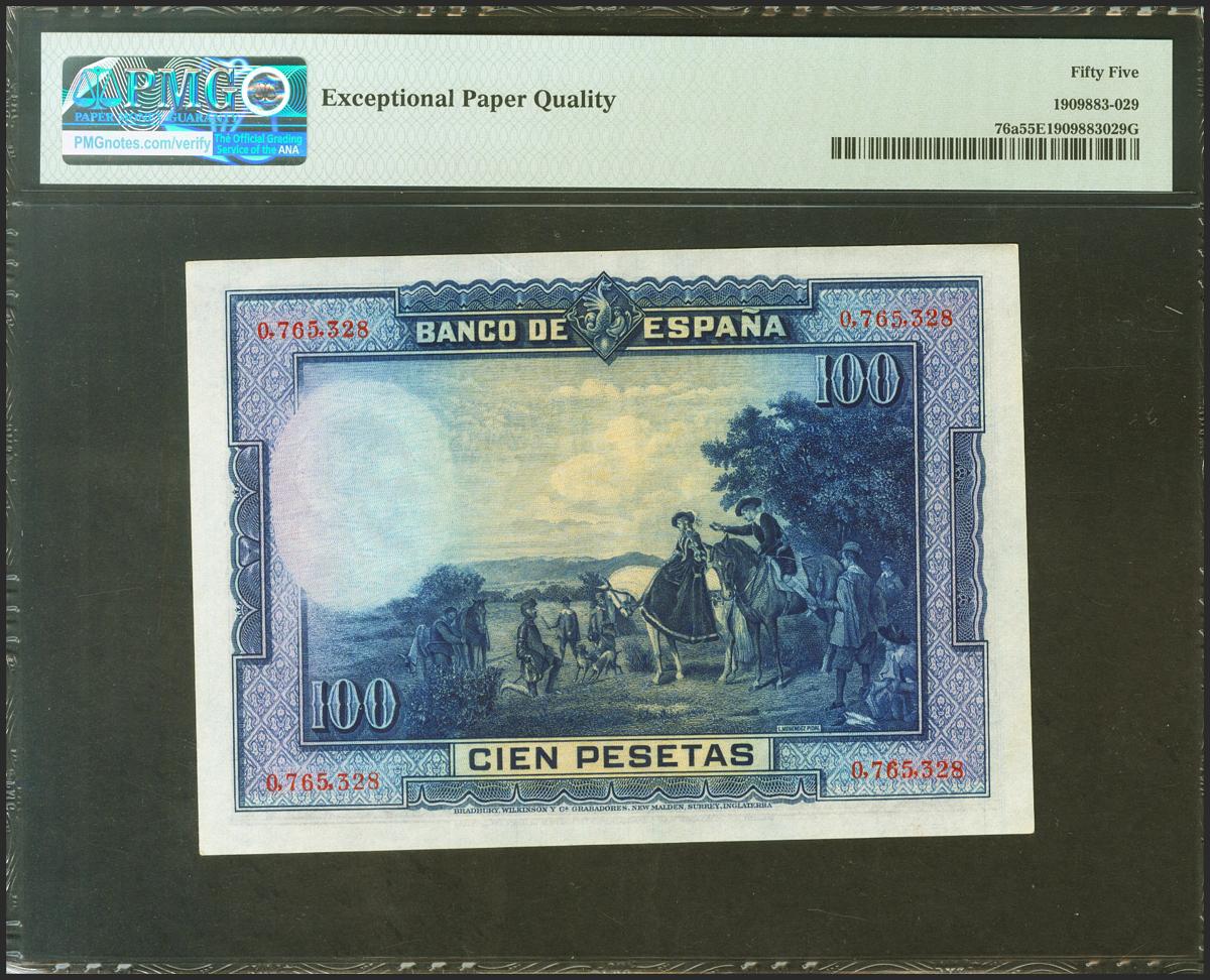 100 Pesetas. 15 de Agosto de 1928. Sin serie. (Edifil 2021: 355, Pick: 76a). Apresto original. EBC+. Encapsulado PMG55EPQ.