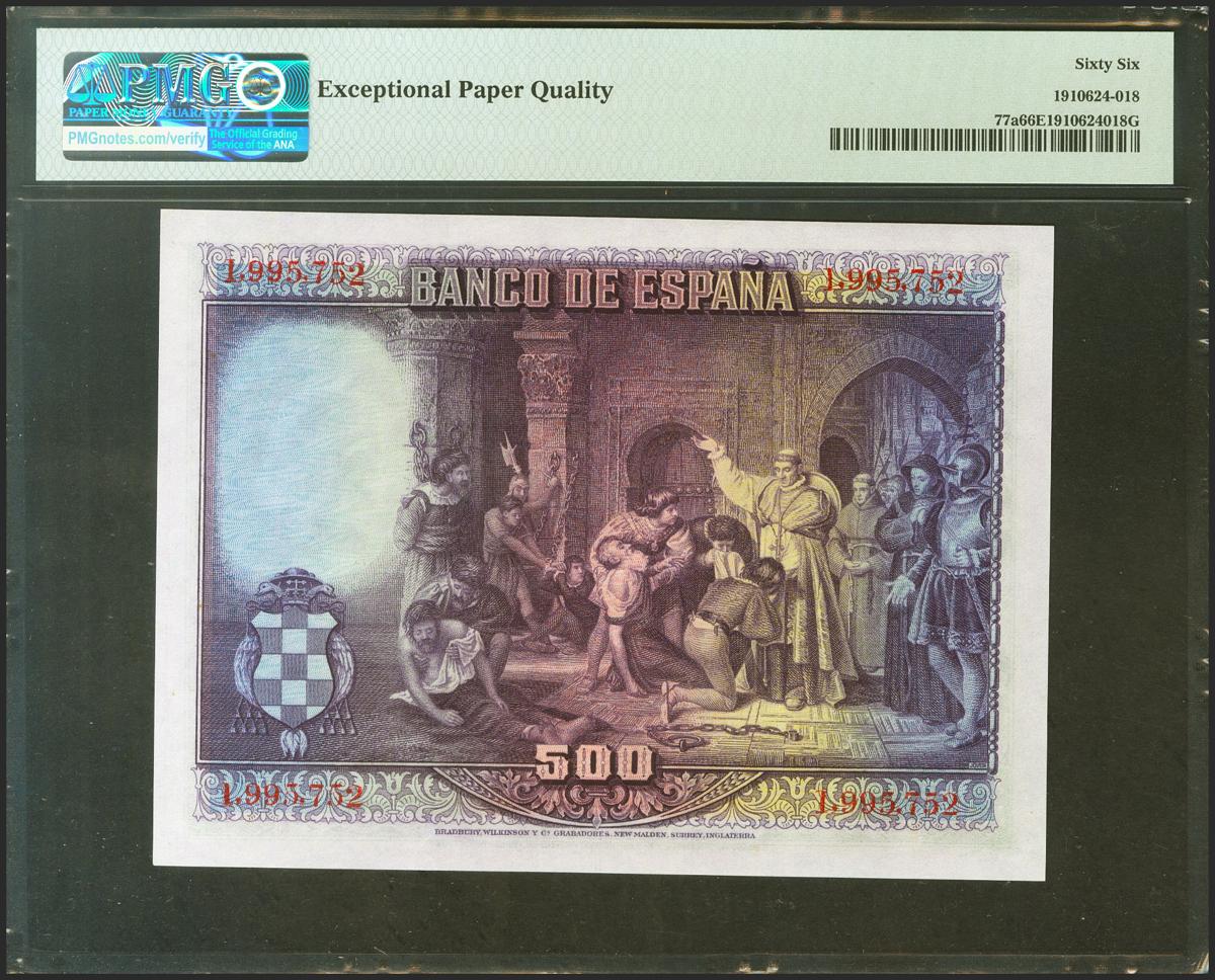 500 Pesetas. 15 de Agosto de 1928. Sin serie. (Edifil 2021: 356, Pick: 77a). Raro en esta excepcional calidad, apresto original. SC. Encapsulado PMG66EPQ.