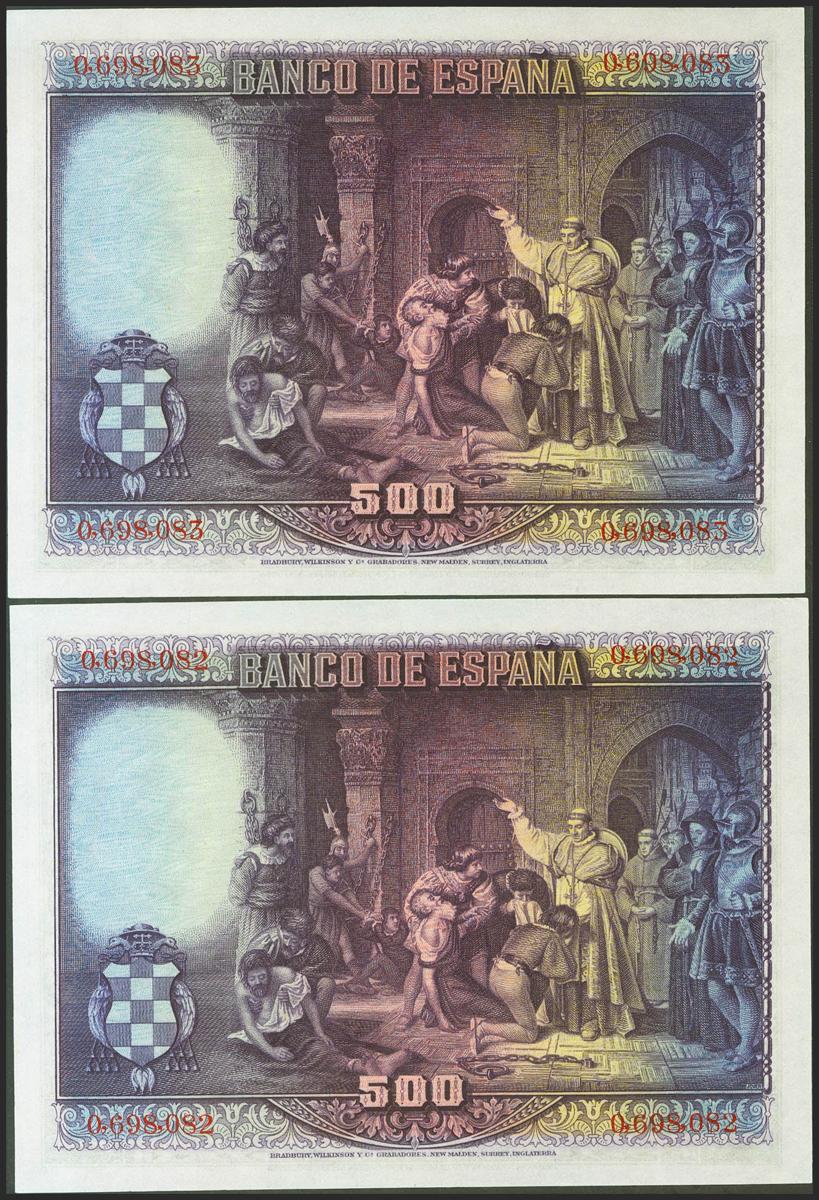 500 Pesetas. 15 de Agosto de 1929. Pareja correlativa. Sin serie. (Edifil 2021: 356). Conserva parte de su apresto original. SC-.