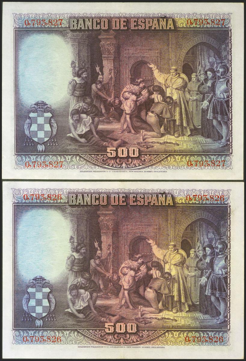 500 Pesetas. 15 de Agosto de 1928. Pareja correlativa. Sin serie. (Edifil 2021: 356). Conserva parte su apresto original. EBC/EBC-.