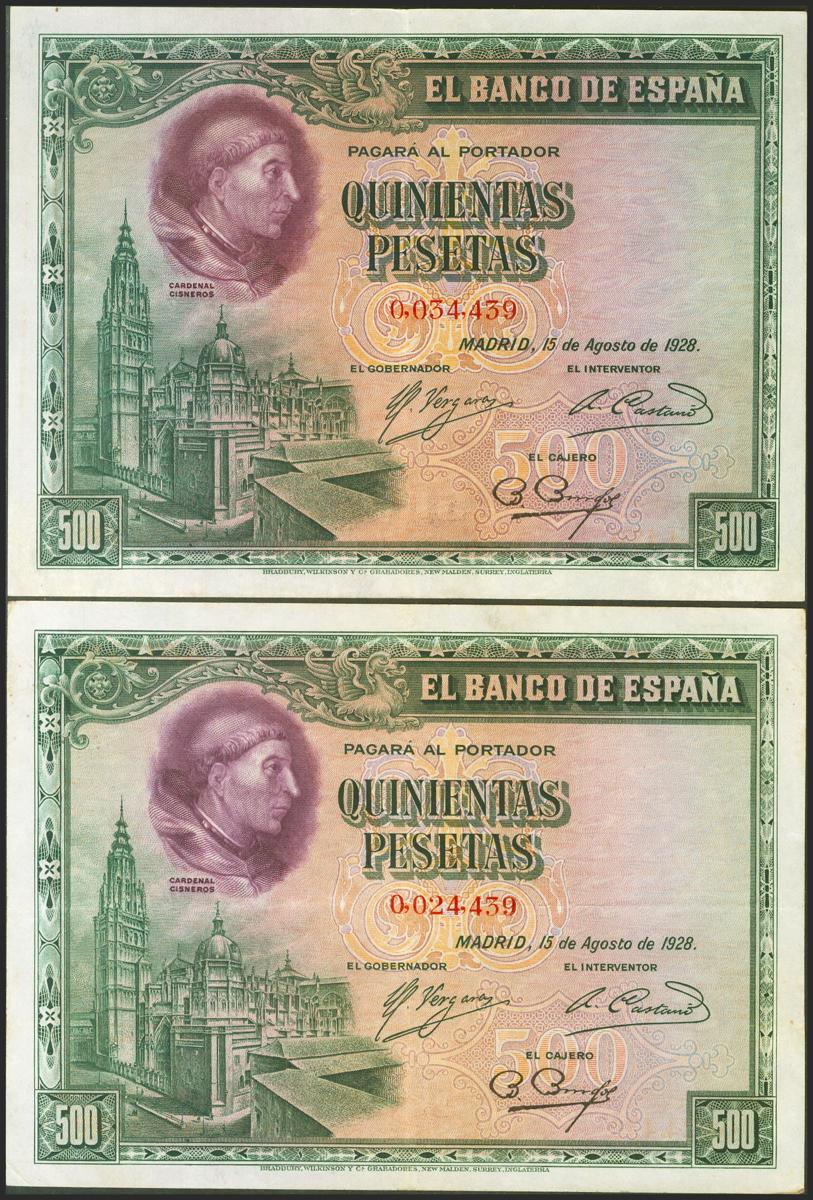 500 Pesetas. 15 de Agosto de 1928. Sin serie y numeración idéntica menos el tercer dígito que es correlativo. (Edifil 2021: 356). Inusual, conserva parte su apresto original. EBC/EBC-.