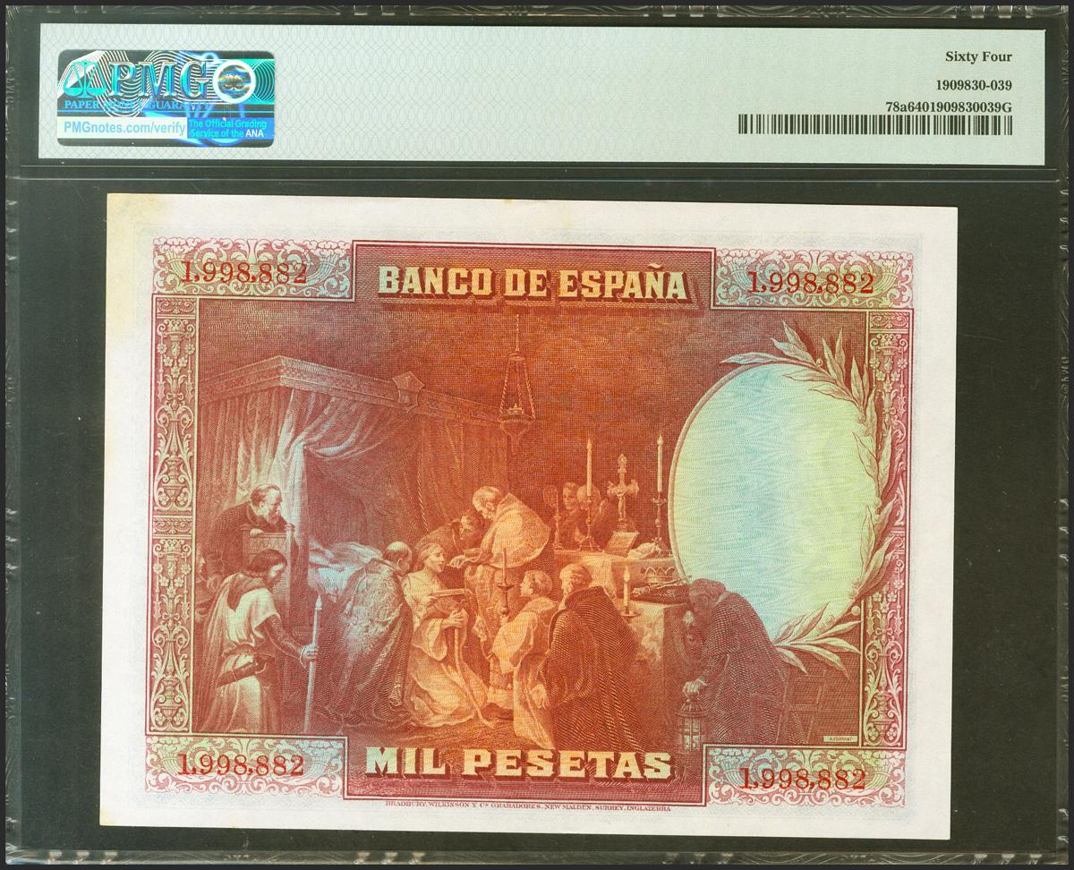 1000 Pesetas. 15 de Agosto de 1928. Sin serie. (Edifil 2021: 357, Pick: 78a). Inusual. SC. Encapsulado PMG64.